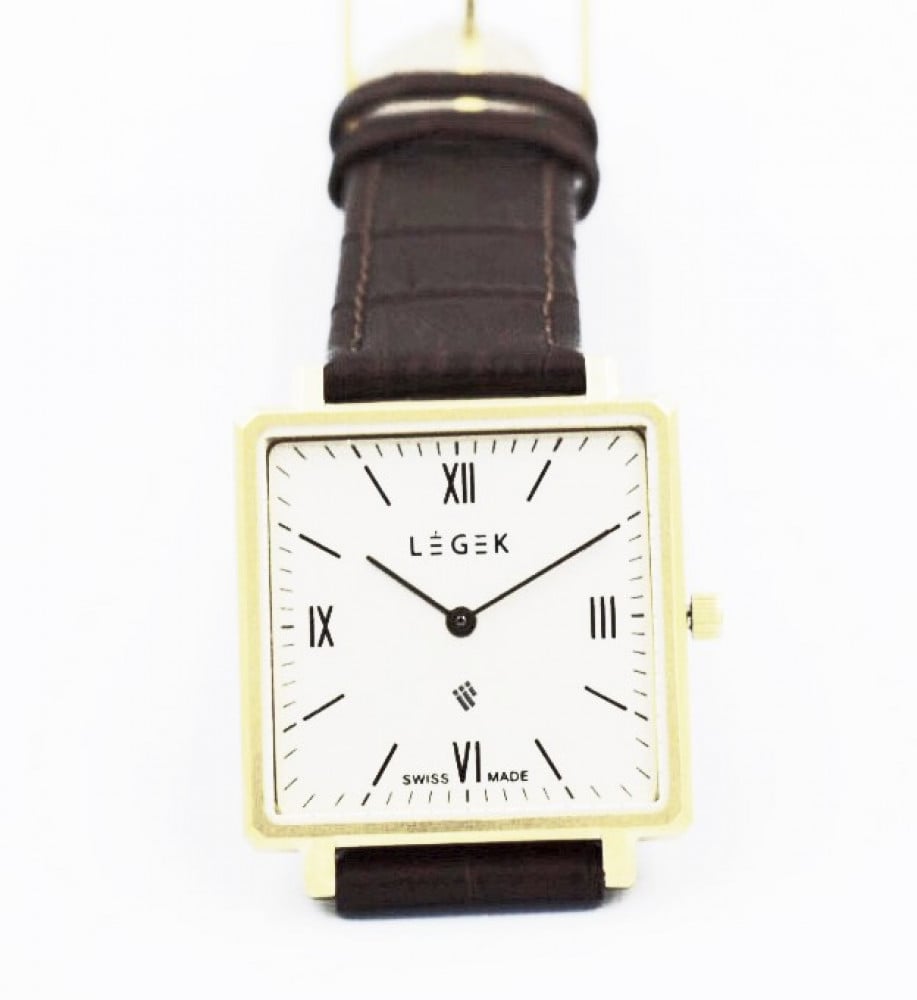 واجهة الساعة بلون **الأصفر البيج الدافئ** مزودة **بأرقام رومانية سوداء** بارزة تضفي لمسة كلاسيكية أنيقة على التصميم، مع عقارب سوداء رفيعة تُبرز جمال التفاصيل. يعكس المينا توازنًا متناغمًا بين الطابع التقليدي والفخامة، مع شعار **"LÉGEK"** وعبارة **"SWISS MADE"** التي تضيف ختمًا للجودة السويسرية المثالية.